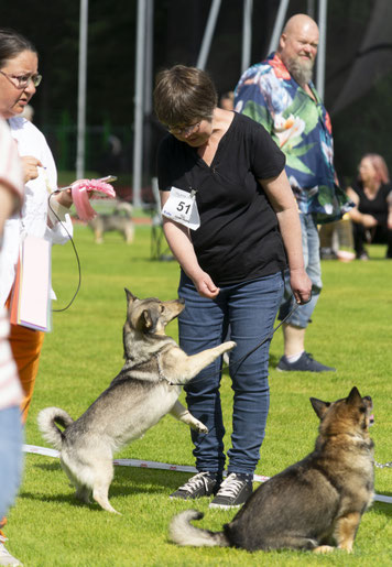 7 years. Complete scissor bite. Very good type. Excellent head. Excellent reach of neck. Topline not level enough. Would prefer a bit more bone. A bit long in body. Angulations correct. Markings of face and harness correct. Movement with a roached back